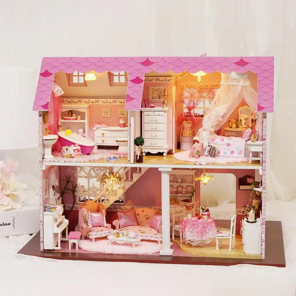 DIY Dollhouse Three-dimensional Assembly Attic Miniature Pink House with Music Movement for Holiday